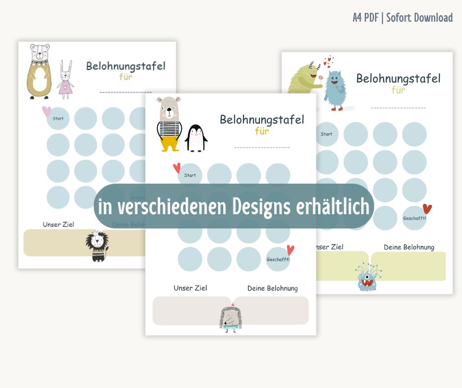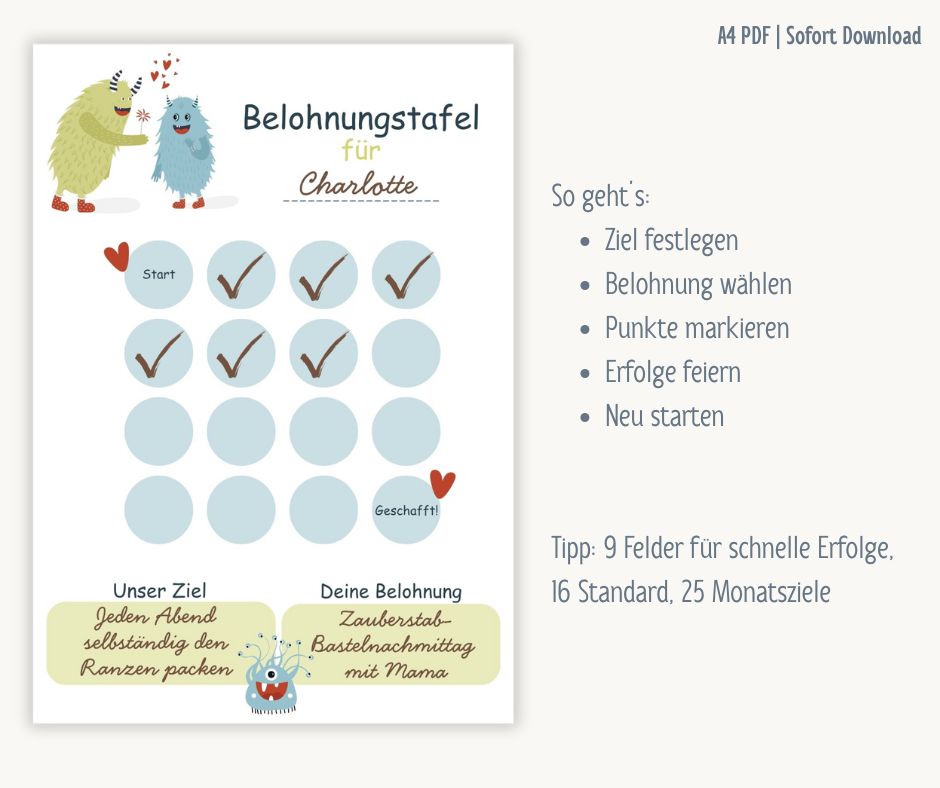 Belohnungstafeln zum Ausdrucken für Zuhause. Du bekommst drei einzelne A4-Dateien: 9 Punkte für schnelle Erfolge, 16 als Standard, 25 für Monatsziele. Name eintragen, Ziel festlegen, Punkte sammeln.