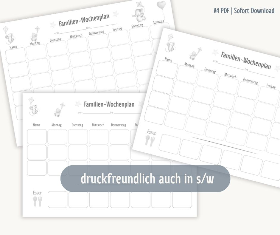 Der Plan macht eure Woche übersichtlich. Links die Namen, oben die Tage, unten das Essen der Woche. Undatiert, damit du die Seiten immer wieder nutzen kannst. Druckfreundlich gestaltet, in Farbe und auch in Schwarzweiß gut lesbar.
